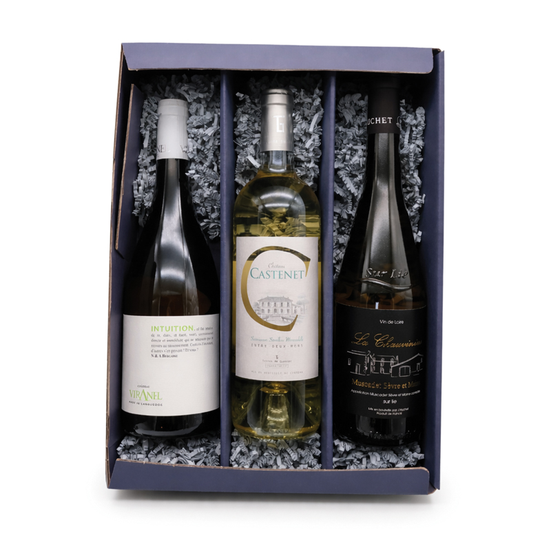 Verschenken Sie ein bisschen Frische in der Flasche! Drei unterschiedliche Weißweine für schöne Abende im Frühjahr oder Sommer… Drei sehr unterschiedliche Weißweine aus verschiedenen Anbaugebieten Frankreichs: Ein spritziger Muscadet sur lie aus der Gegend von Nantes, ein frisch-fruchtiger Entre-deux Mers aus Bordeaux und ein aromatischer Saint Chinian aus Südfrankreich.